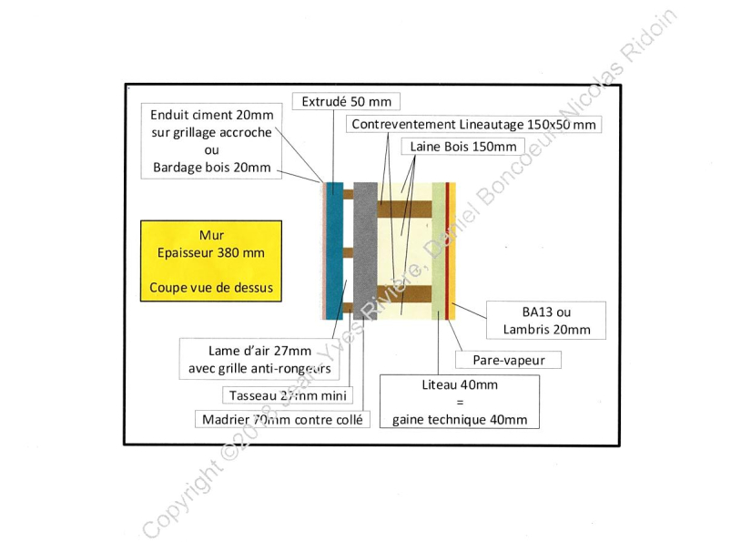 L’échantillon de l’ossature bois : Toute la fabirication est inscrite sur l’échantillon. Les murs font en moyenne 36cm d’épaisseur et 38 cm s’il y a un crépi.